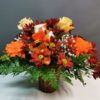 – Arreglo de rosas. gerberas. Alstromeria. Verdes vdos y paniculata en cesta de mimbre