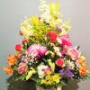 Precioso Arreglo floral de generoso volumen. Estilo clásico y forma triangular. Creación de espectacular belleza. Sustituto de coronas.