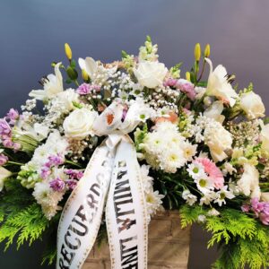 -Arreglo floral con lilium oriental rosa y rosa blanca con flores en tonos pastel